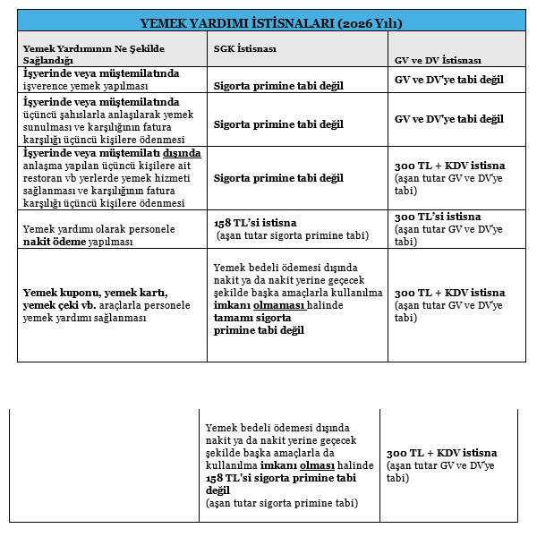 Personele Sağlanan Yemek Yardımları ve 2026 Yılı SGK ve Vergi İstisna Tutarları